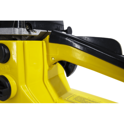 Бензопила оснащена системой автоматической подачи смазки, благодаря которой цепь из 72 звеньев легче скользит и не перегревается при постоянном трении. Прорезиненные рукоятки пилы обеспечивают крепкий хват, что гарантирует безопасность при эксплуатации. В качестве дополнительной защиты присутствует кнопка, предохраняющая от случайного включения агрегата. Для натяжки цепи можно использовать специальный ключ, который поставляется в комплекте с бензопилой.