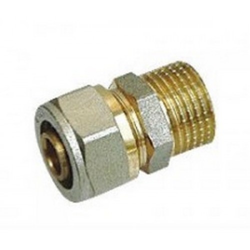 Двухсторонний прямой латунный никелированный фитинг для соединения металлополимерной трубы и компонента системы с резьбовым подключением.