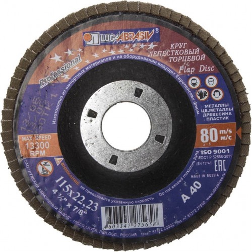 • ЛУГА 115х22.23 мм, P40, для УШМ, круг лепестковый торцевой абразивный для шлифования 3656-115-40
