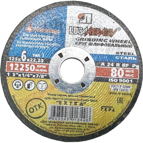 Круг шлифовальный абразивный 125 мм для УШМ по металлу ЛУГА 3650-125-06, предназначен для шлифовки и зачистки металлических конструкций и заготовок. Многослойное армирование бакелитовой связки полиамидными сетками обеспечивает прочность круга и безопасность в работе. Изготавливается на полностью автоматизированных роторных прессах с компьютерным контролем приготовления и смешивания абразивной смеси.