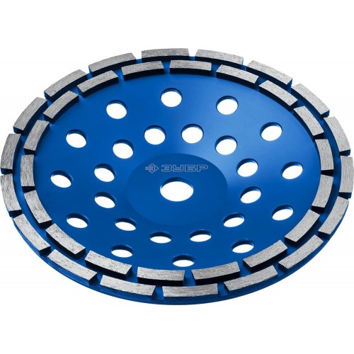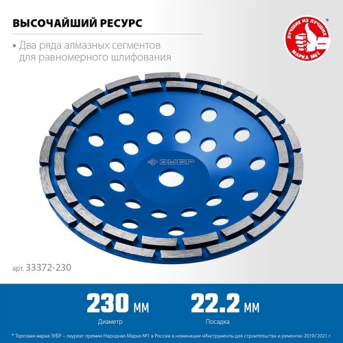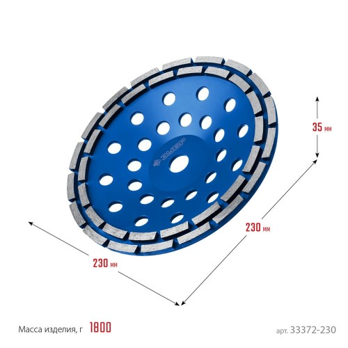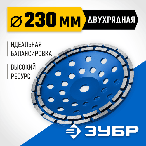 Алмазная чашка ЗУБР 33372-230_z01, предназначены для сухого шлифования искусственных и природных строительных материалов: бетона, кирпича, камня, плитки. Используются на УШМ. Высокая концентрация алмазов. Синтетические алмазы повышенной твердости. Два ряда алмазных сегментов для равномерного шлифования и большого объема работ. Высокопрочное стальное фрезерованное основание чашки не допускает биения и дисбаланса в процессе работы.