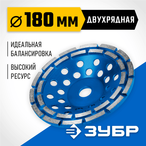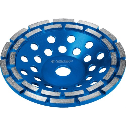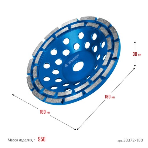 Алмазная чашка ЗУБР 33372-180_z01, используется на УШМ для шлифования бетонных материалов, гранита, природного и искусственного камня. Не требует принудительного водяного охлаждения. Имеет отверстия для естественного охлаждения чашки в процессе шлифования. Корпус алмазной чашки изготовлен из высокопрочной стали. Высота алмазных сегментов 5 мм обеспечивает продолжительный рабочий ресурс шлифовальной чашки (до 600 квадратных метров площади). Два ряда алмазных сегментов для равномерного шлифования и большого объема работ. Фрезерованное основание чашки не допускает биения и дисбаланса в процессе работы. Каждое изделие проходит строгий контроль качества, особое внимание уделяется сбалансированности, т.к. инструмент работает на больших оборотах.