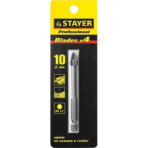 STAYER 10 мм, 4-х резцовый, шестигранный хвостовик, сверло по стеклу и кафелю 2985-10_z01