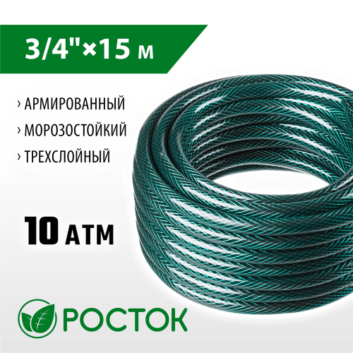 Шланг для полива армированный РОСТОК 40308-3/4-15_z01, предназначен для поливочных работ на садово-огородном участке. Трехслойный эластичный шланг изготовлен из высококачественного ПВХ и армирован прочными нейлоновыми нитями. Благодаря особой технологии армирования достигается высокая устойчивость формы шланга. Поверхность шланга не восприимчива к ультрафиолетовым лучам. Шланг является экологически чистым изделием - не содержат кадмий и барий. Внутренняя поверхность шланга исключает возможность возникновения водорослей.