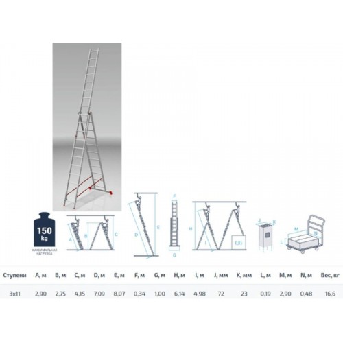 Высота лестницы - 709см, высота стремянки - 275см, высота секции - 290см. Макс. нагрузка -150 кг. Варианты использования: - приставная лестница; - приставная выдвижная лестница; - стремянка; - стремянка с выдвинутой секцией; - функция лестничных пролётов. Технические преимущества: - максимальная прочность и надёжность при небольшом весе изделия; - стойки и ступени изготовлены из прессованного профиля; - многократная развальцовка в соединении ступеней со стойками обеспечивает высокую прочность и долговечность; - рифлёные ступени с шагом 260 мм для безопасного подъёма и спуска; - алюминиевые направляющие кронштейны надёжно удерживают выдвижную секцию во всех рабочих положениях; - зацепы с автоматическим фиксатором; - широкая поперечная траверса обеспечивает высокую устойчивость; - функция лестничных пролётов; - надёжно закреплённые на стойках и траверсе пластиковые наконечники препятствуют скольжению; - верхняя секция легко вынимается и устанавливается и может служить отдельной приставной лестницей; - функция лестничных пролётов с использованием верхней съёмной секции.