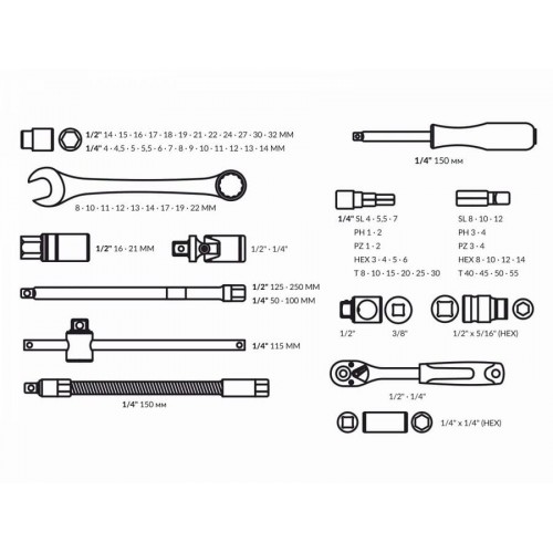 + Ключ комбинированный: 8, 10, 11, 12, 13, 14, 17, 19, 22 мм; + Головка торцевая 14: 4, 4.5, 5, 5.5, 6, 7, 8, 9, 10, 11, 12, 13, 14 мм; + Головка с насадкой HEX 14: H3, H4, H5, H6; + Головка с насадкой TORX 14: T8, T10, T15, T20, T25, T30; + Головка с насадкой SL 14: SL4, SL5.5, SL7; + Головка с насадкой PH 14: PH1, PH2; + Головка с насадкой PZ 14: PZ1, PZ2; + Головка торцевая 12: 14, 15, 16, 17, 18, 19, 21, 22, 24, 27, 30, 32 мм; + Свечная головка 12: 16, 21 мм; + Насадка 516 HEX: H8, H10, H12, H14; + Насадка 516 TORX: T40, T45, T50, T55; + Насадка 516 PH: PH3, PH4; + Насадка 516 PZ: PZ3, PZ4; + Насадка 516 SL: SL8, SL10, SL12; + Трещотка 14; + Переходник (держатель для бит) 14х14(HEX); + Удлинитель 14 50 мм; + Удлинитель 14 100 мм; + Кардан 14; + Вороток-отвертка 14 150 мм; + Вороток 14 с плавающей головкой 115 мм; + Гибкий удлинитель 14; + Трещетка 12; + Переходник (держатель для бит) 12х516(HEX); + Удлинитель 12 125 мм; + Удлинитель 12 250 мм; + Кардан 12; + Переходник 38(F)х12(М) с отверстием; + Кейс