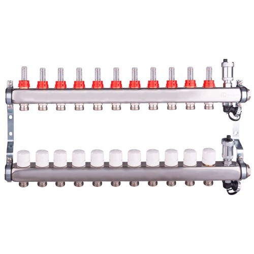 Комплект поставки Коллектор подающий в сборе с настроечными клапанами; Коллектор принимающий в сборе с регулирующими клапанами; Воздухоотводчик с отсекающим клапаном 2 штуки; Дренажный клапан 2 штуки; Кронштейн крепления раздвижной; Заглушка G1″ в коллектор 2 штуки