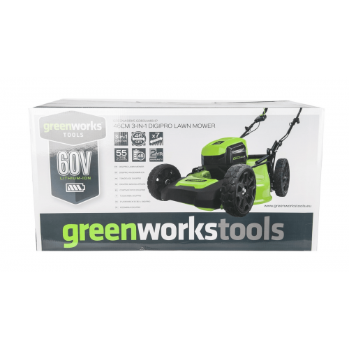 Газонокосилка Greenworks GD60LM46HP 60V 2502807 (46 см) бесщеточная аккумуляторная — полупрофессиональная газонокосилка служащая хорошей альтернативой бензиновым газонокосилкам благодаря современному индукционному двигателю серии DigiPro.