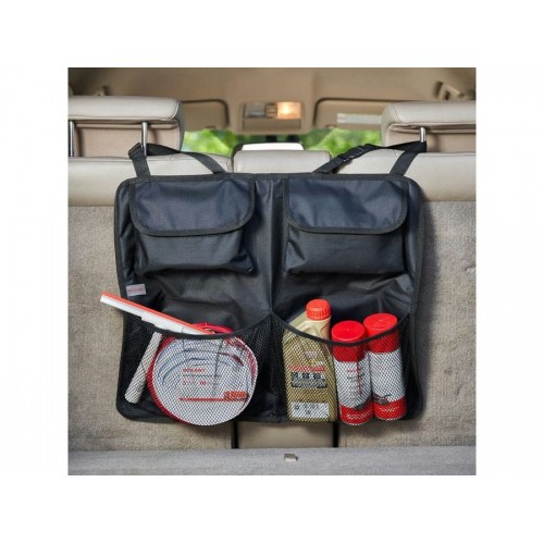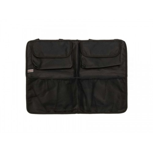 Органайзер на спинку заднего сиденья применяется для компактного размещения различных аксессуаров в багажнике автомобиля. Крепится за подголовники спинки заднего сиденья. Закрывает 23 площади спинки сиденья. Имеет 4 вместительных кармана.