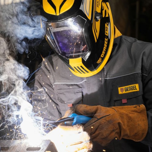 Защитный лицевой щиток (маска сварщика) Denzel F10 89719 со смотровым окном размером 100 x 96 мм, системой Real Color и функцией затемнения в диапазоне DIN 4-8/9-14, предназначен для защиты глаз, лица пользователя, области шеи и частично области плеч от искр, брызг расплавленного металла, а также инфракрасного и ультрафиолетового излучения. Используется во время проведения сварочных работ в различных режимах (MMA, MIG/MAG, TIG). 4 оптических датчика обеспечивают эффективную работу светофильтра. Благодаря системе «хамелеон» экран автоматически темнеет при поджиге дуги (время реагирования 1/25000 с) и светлеет после окончания сварки.