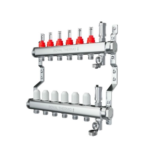 Коллекторы Royal Thermo поступают в сборе и включают подающий и обратный коллекторы, регулировочные вентили с встроенными расходомерами, термостатические вентили с возможностью установки сервопривода, воздухоотводчики и сливные краны и заглушки.