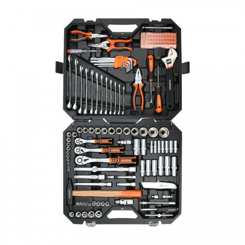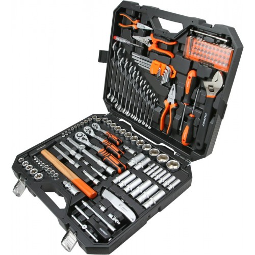 Набор бит, головок, шарниров, адаптеров, шестигранных и комбинированных ключей предназначены для монтажа и демонтажа резьбовых соединений. Строительный нож, тонкогубцы, отвертки, разводной ключ, ножницы, пассатижи и молоток будут полезны в бытовых ремонтных работах. Удлинители, включая гибкие и телескопический, для работы в труднодоступных местах. Магнитный держатель для бит используется при монтажных работах разной сложности, удерживая оснастку. Реверсивные трещотки (72 зуба, шаг 5 градусов) с кнопкой быстрого съема головки. Удобные рукоятки с резиновыми вставками снижают нагрузку на запястье.