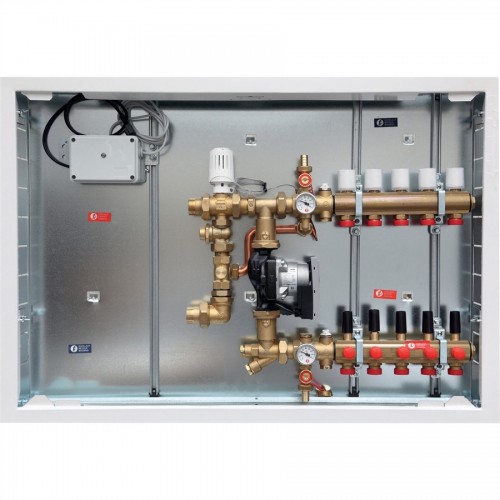 Распределительный коллектор с узлом смешения для низкотемпературных систем с фиксированным значением температуры, термостатический контроль, 3-х скоростной циркуляционный насос, предохранительный термостат K373, узел наполнения и слива, выпуск воздуха, измерительные термометры. Подключения 1”. Высота шкафа: 605 мм. Глубина шкафа: 110 мм.