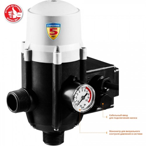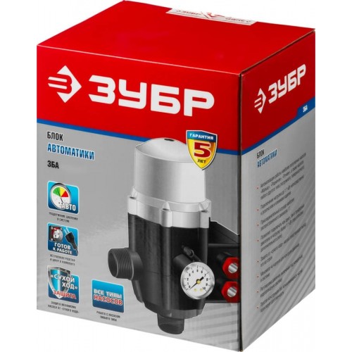 Блок автоматики ЗУБР ЗБА, предназначен для организации системы автоматического водоснабжения путем включения/выключения насоса при переменном расходе. Автоматизация работы наиболее популярных насосов Малыш, Родничок, Ручеек, а также насосов любого другого типа (погружного, поверхностного). Подключение нагрузки до 1.1 кВт непосредственно к розетке или к клеммам изделия. Позволяет подключать как одно, так и трехфазные двигатели и нагрузку более 1.1 кВт (при установке дополнительного реле). Присоединительный штуцер наиболее распространенного диаметра 1". Защита от "сухого хода" насоса предотвращает выход его из строя. Манометр на корпусе для контроля давления в системе. Регулировка давления включения под конкретную водопроводную систему. Простая конструкция без изнашивающихся частей гарантирует долговечность.