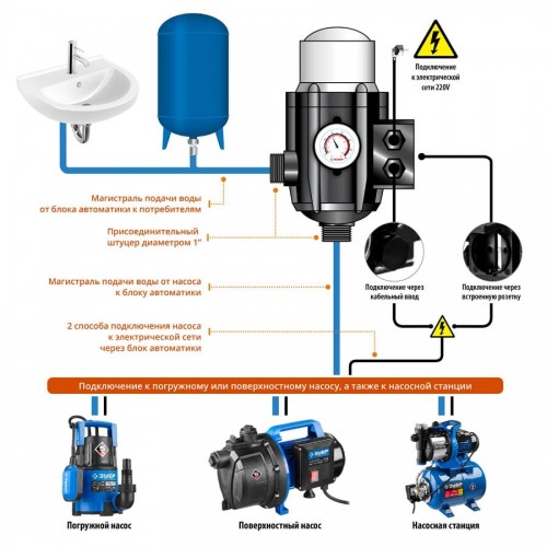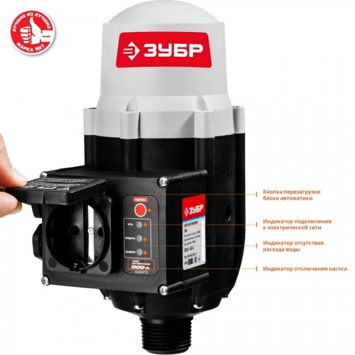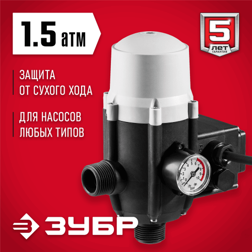 ЗУБР 1", давление срабатывания 1.5 Атм, макс. мощность подключаемых насосов 1.1 кВт, блок автоматики ЗБА