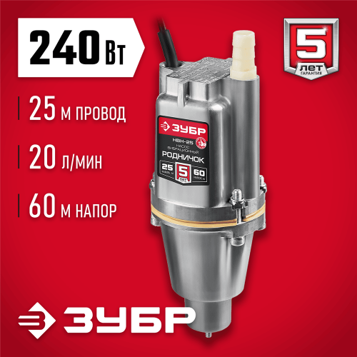 ЗУБР 25 м провод, с нижним забором воды, насос вибрационный Родничок-Н НВН-25 Мастер