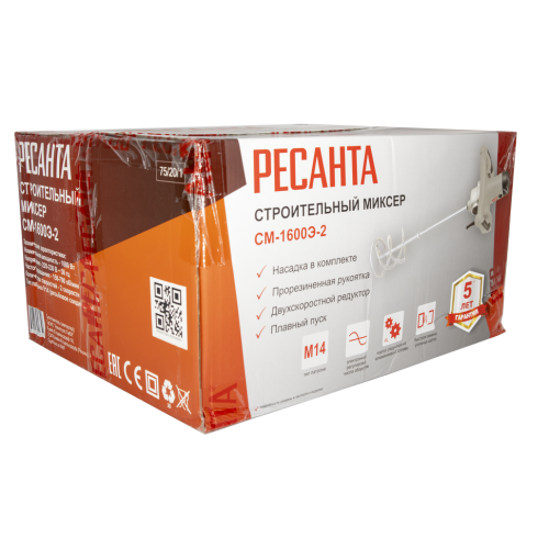 Строительный миксер Ресанта СМ-1600Э-2 - электрический инструмент, предназначенный для перемешивания различных компонентов (сухой смеси, жидкости) при получении различных строительных и отделочных материалов (бетон, штукатурка, различные клеевые смеси, краска и т.д.).