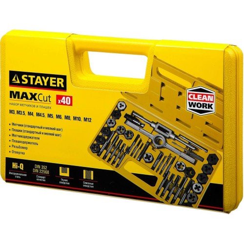 Набор резьбонарезной STAYER 2805-H40_z01, предназначен для нарезания внутренней и внешней метрической резьбы, не требующей чистовой доводки на металлических изделиях и восстановления ее поврежденных участков. Использование качественных материалов и современного оборудования гарантирует высокий рабочий ресурс и удобство при нарезании резьбы.