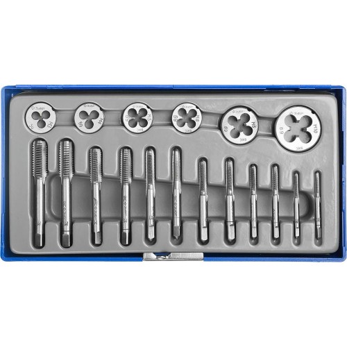 Набор предназначен для резьбонарезных работ в конструкциях и заготовках из сталей и цветных металлов. Метчики ручные однопроходные используются для нарезания внутренней метрической резьбы с нормальным шагом в глухих и сквозных отверстиях. Плашки предназначены для нарезания внешней метрической резьбы с нормальным шагом.