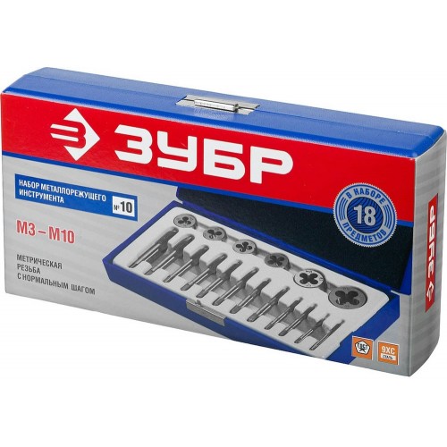 Набор резьбонарезной ЗУБР 28120-H18, предназначен для резьбонарезных работ в конструкциях и заготовках из сталей и цветных металлов. Метчики ручные однопроходные используются для нарезания внутренней метрической резьбы с нормальным шагом в глухих и сквозных отверстиях. Плашки предназначены для нарезания внешней метрической резьбы с нормальным шагом. Резьбонарезной инструмент ЗУБР производится на самом точном современном оборудовании. Контроль каждого этапа производства гарантирует безупречное качество инструмента. В комплект входят: