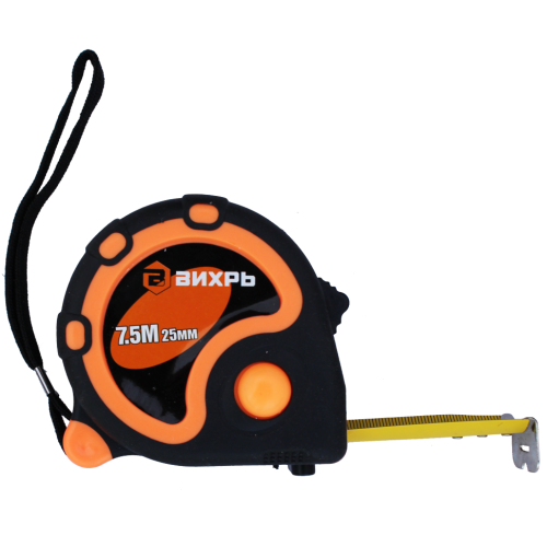 Рулетка измерительная ВИХРЬ 7,5мх25мм изготовлена из ударопрочного пластика с прорезиненным покрытием, защищающим ее от повреждений. Измерительная лента из высококачественной стали с нейлоновым покрытием обеспечит долговечность и стойкость к истиранию шкалы. Есть фиксатор механизма сматывания полотна. Также предусмотрен ремешок для переноски на руке. Длина ленты 7,5 метров, ширина 25 мм.
