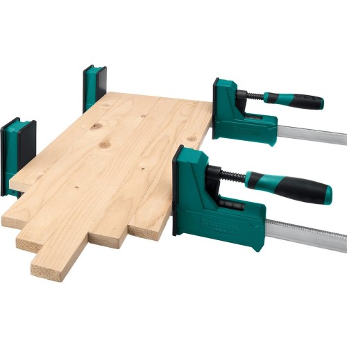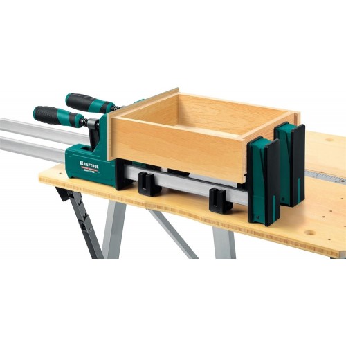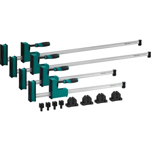 Профессиональный набор корпусных струбцин и принадлежностей. Надёжные струбцины KRAFTOOL GRAND с постоянно параллельными губками для всевозможных столярных работ (1000мм х 2шт и 600мм х 2шт). Работа на сжатие и на распор. Бережная фиксация заготовок благодаря мягким переставным накладкам. Высокая сила сжатия. Силовые элементы из закаленной стали и высокопрочного чугуна. Комплект принадлежностей для фиксации струбцин на рабочем месте под 90˚ и под произвольными углами. Крепления саморезами либо в готовые отверстия верстака.