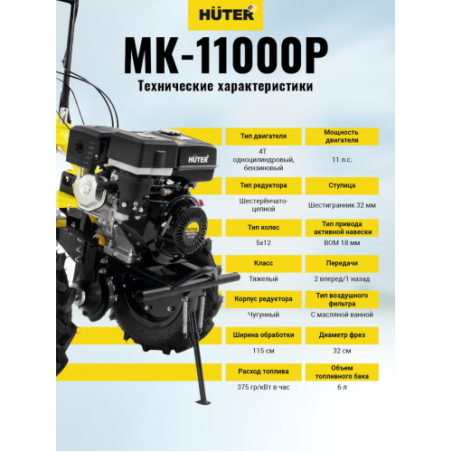 - Двигатель. На мотоблоках HUTER применяются бензиновые двигатели внутреннего сгорания. Двигатели культиваторов снабжаются автоматическими регуляторами частоты вращения, упрощающими работу оператора. Диапазон номинальной мощности линейки наших культиваторов позволяет выбрать подходящий для любых видов работ.