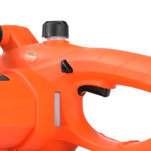 Продолжительная комфортная работа обеспечивается благодаря малому весу пилы и низкому уровню шума. Техническое обслуживание практически не требуется, пильная цепь смазывается автоматически. Для безопасной работы пила оснащена предохранителем клавиши старта и щитком для защиты рук. На рукоятке предусмотрена скоба крепления сетевого кабеля.
