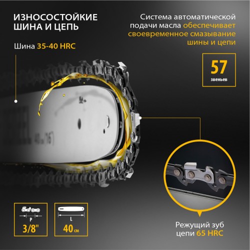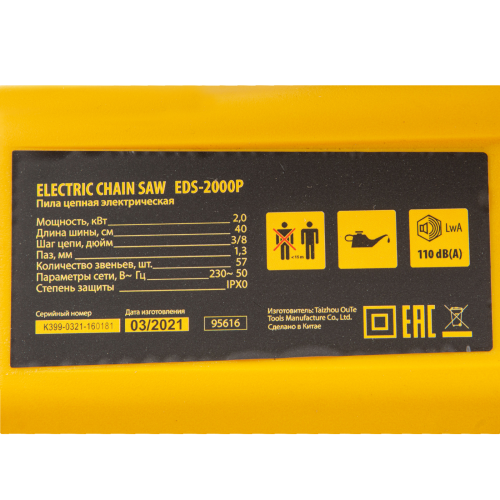 Пила цепная электрическая DENZEL EDS-2000P, 2 кВт, шина 40 см, шаг 3/8, 57 звеньев