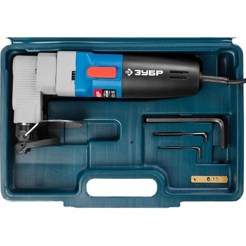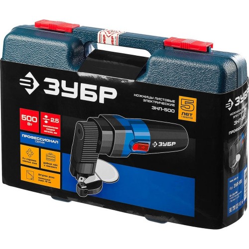 Ножницы по металлу электрические ЗУБР ЗНЛ-500, предназначены для резки листового металла. Возможность резать листовой металл толщиной до 2,5 мм. Позволяет производить фигурную резку с радиусом до 40 мм. Удобный хват для большего комфорта и лучшего качества работы. Отличный обзор линии реза. Высокая скорость резки благодаря мощному двигателю и специальному механизму. Защитный козырек защищает руки и предотвращает травмы от стружки. Ножи с 4-мя режущими гранями. Быстрая система смены ножей для большей производительности. Набор щупов в комплекте для настройки механизма под толщину разрезаемого металла. Удобный пластиковый кейс для хранения и переноски.