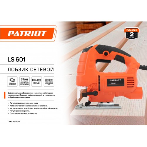 Лобзик Patriot LS 601 мощность 690 Вт, макс толщина дерева 65 мм, 4 поз., маятниковый ход, регулировка скорости