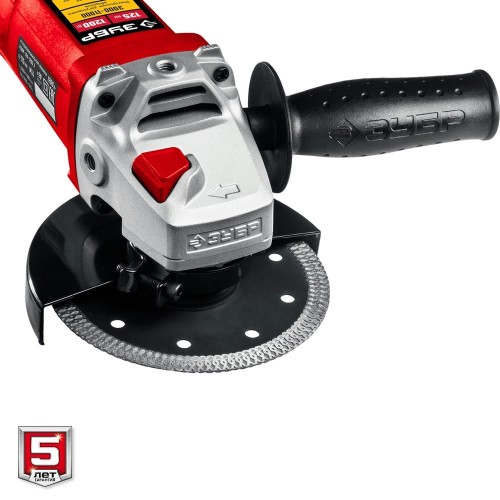 Угловая шлифмашина ЗУБР УШМ-125-1205 Э, предназначена для зачистки, шлифовки и резки металлов, обработки бетона и камня при установке соответствующих шлифовальных, отрезных, алмазных кругов. Двуручный хват позволяет надежно удерживать ее, регулятор оборотов расположен прямо под пальцем и широкий выключатель для удобства работы. Конструктивные решения, защищающие изделие от пыли (пылезащищенный выключатель и лабиринтные уплотнения подшипников), гарантируют надежную работу инструмента долгие годы. Специальная конструкция щеткодержателя, предотвращающая повреждение коллектора при полном износе щеток. Возможность установки дополнительной рукоятки в трех положениях. Удобная блокировка шпинделя для быстрой замены диска. Корпус редуктора из алюминиевого сплава лучше отводит тепло.