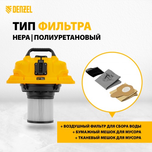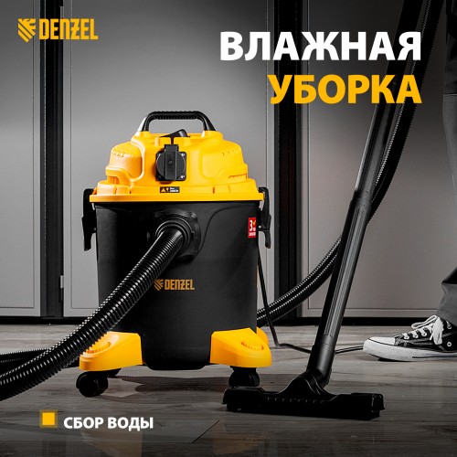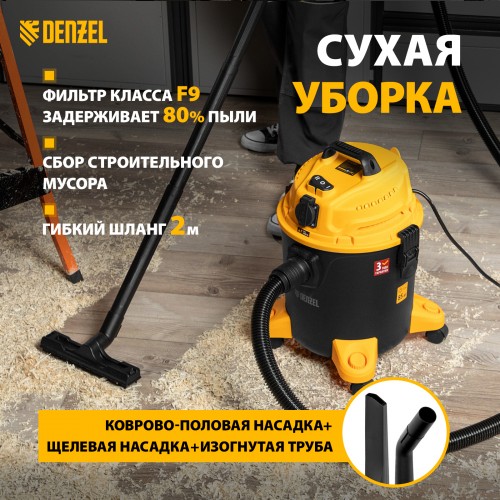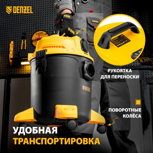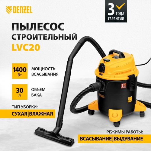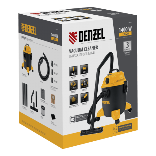 Пылесос строительный DENZEL LVC20, 1400 Вт, бак 20 л, шланг 3 м, розетка с автосинхр.