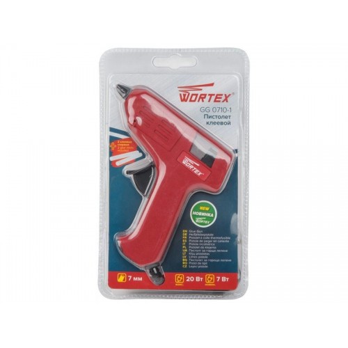 Пистолет клеевой WORTEX GG 0710-1 в блистере + 2 клеевых стержня (20 Вт, 7 мм, 8 г/мин)