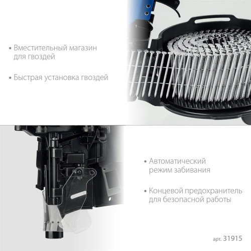 Нейлер пневмоинструмент предназначен для производства паллет (поддонов) и других изделий из дерева, таких как тара, ящики и упаковка с гвоздями длиной 65-100мм барабанного типа.