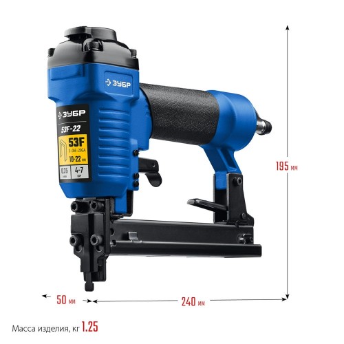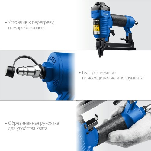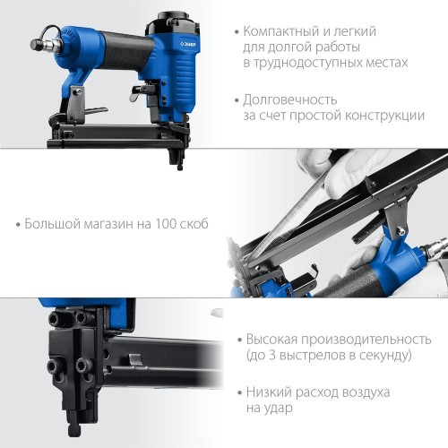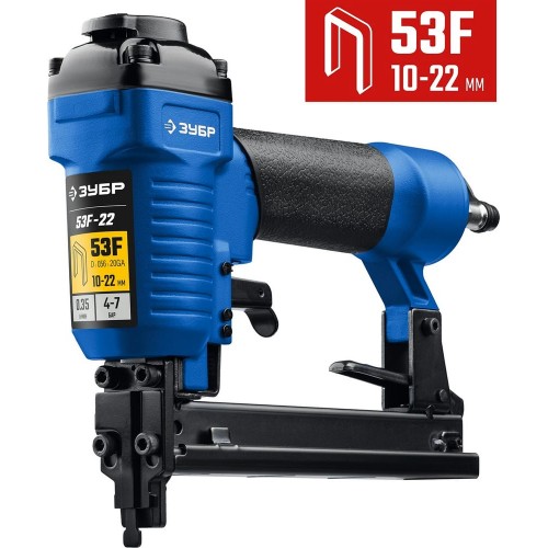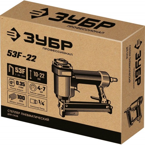 Степлер пневматический (скобозабиватель) ЗУБР 31935, предназначен для внутренней отделки, например, при обшивке стен и потолков или монтаже плинтусов. Компактный и легкий для долгой работы в труднодоступных местах. Высокая производительность (до 3 выстрелов в секунду). Низкий расход воздуха на удар. Прочный алюминиевый корпус. Устойчив к перегреву, пожаробезопасен. Обрезиненная рукоятка для удобства хвата. Большой магазин на 100 скоб. Применяемый тип расходных материалов - скобы тип 53F (10-22 мм).