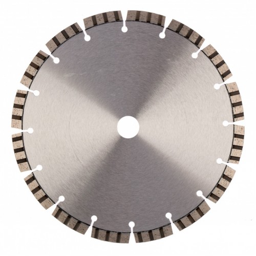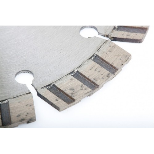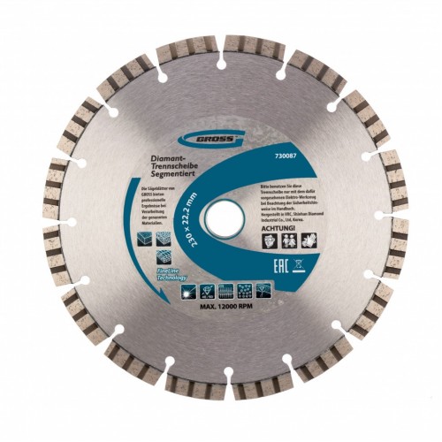 Универсальный алмазный диск ТМ GROSS предназначен для резки материалов: бетон, армированный бетон, кирпич, камень, гранит, шлакоблок, мрамор, тротуарная плитка. Тип диска 1A1RSS Turbo с лазерной приваркой сегментов, обеспечивает наилучшее крепление сегментов, повышая стойкость диска к перегрузкам и перегреву. Режущий сегмент высотой 10 мм, с высокой концентрацией крупных синтетических алмазов 40–50 мкм повышает износостойкость диска и увеличивает скорость реза. Для использования на УШМ (болгарке) соответствующего типоразмера. Сухой рез, без использования водяного охлаждения. Рекомендован для профессионального использования и большого объема работ.
