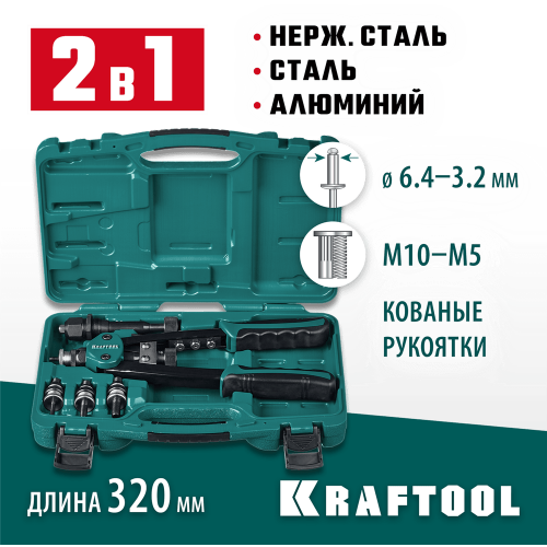 Комбинированный двуручный заклепочник KRAFTOOL - максимально компактный и надежный инструмент, который с легкостью выдерживает высокие нагрузки и предназначен для установки резьбовых и вытяжных заклепок из алюминия, стали и нержавеющей стали.
