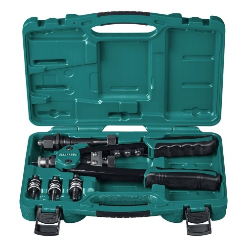 Заклепочник KRAFTOOL 31181, предназначен для установки резьбовых и вытяжных заклепок из алюминия, стали и нержавеющей стали. Рычажная конструкция инструмента многократно увеличивает приложенные усилия.