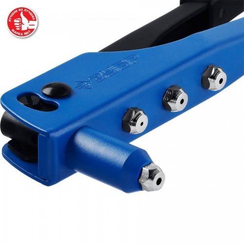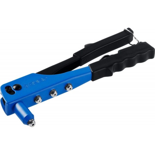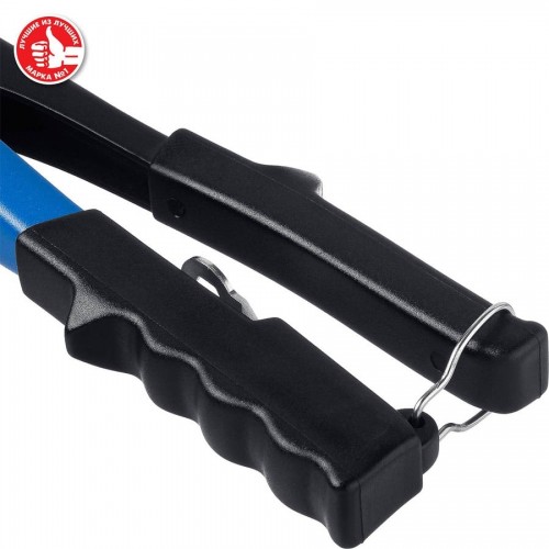 Применяется для установки вытяжных заклепок. Используется с алюминиевыми и стальными заклепками диаметром 2,4, 3,2, 4,0, 4,8 мм, нержавеющими заклепками диаметром 2,4, 3,2, 4,0 мм Способ применения: 1. Просверлите отверстие 2. Установите заклепку в заклепочник, а затем в отверстие 3. Сжимайте и разжимайте рукоятки заклепочника до момента откусывания хвостовика заклепки 4. Заклепка установлена