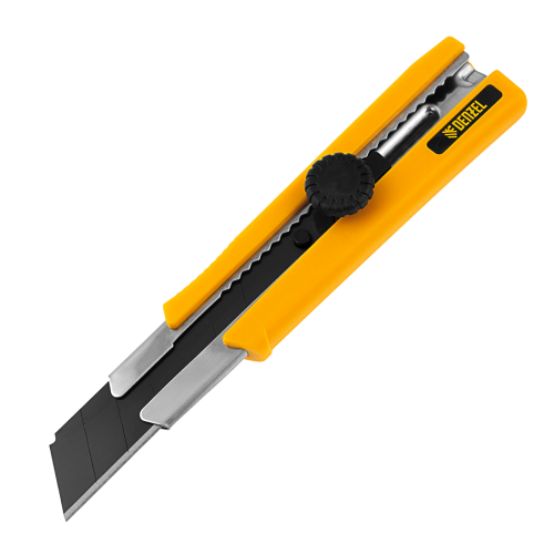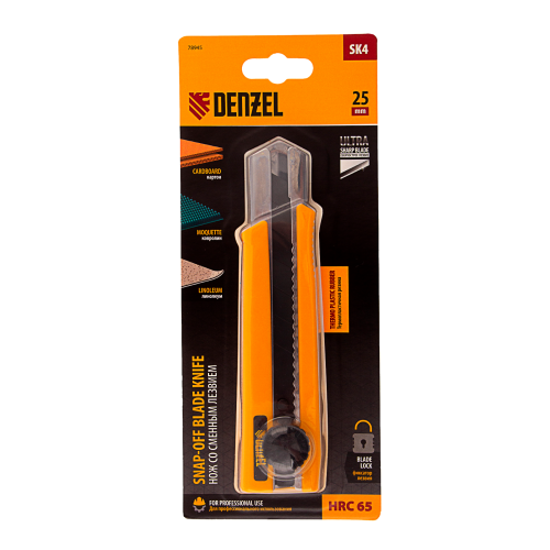 Нож DENZEL 25 мм, сменное лезвие, SK4, корпус из TPR, метал. направляющая, винтовой фиксатор