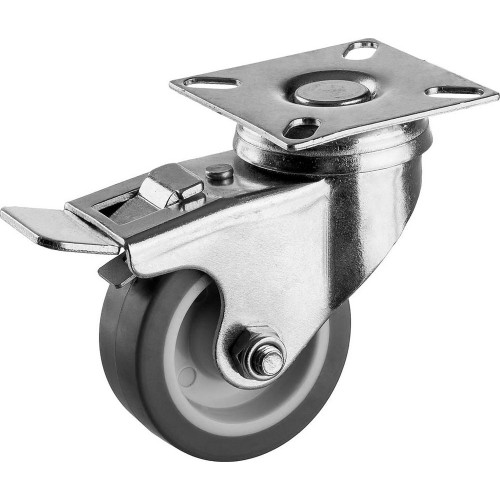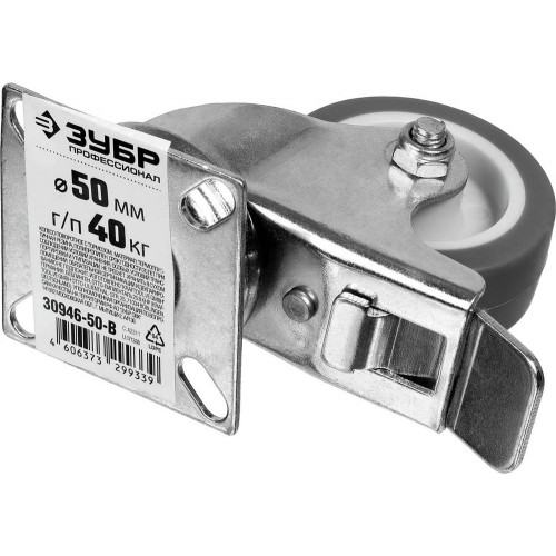 Колесо поворотное c тормозом ЗУБР 30946-50-B применяются для перемещения тележек и легковесного оборудования. Рекомендуется для полов с неровностями и препятствиями, а также для использования внутри помещений и на улице. Колесные опоры обеспечивают удобное перемещение тележек и контейнеров легкой и стандартной грузоподъемности, легковесного оборудования, строительных лесов и прочих конструкций. Благодаря износостойким материалам колесные опоры находят применение как в помещениях, так и вне их. Крепежная платформа свободно вращается благодаря шариковому подшипнику. Могут использоваться в условиях повышенной влажности и слабых кислот. Стальной штампованный диск обеспечивает повышенную прочность. Игольчатый подшипник обеспечивает легкость вращения колеса. Специальная прокладка предотвращает попадание пыли в полость шарикового подшипника на опоре. Наличие педали тормоза обеспечивает возможность блокировки колеса в любом положении. Цинковое покрытие надежно защищает изделие от коррозии.