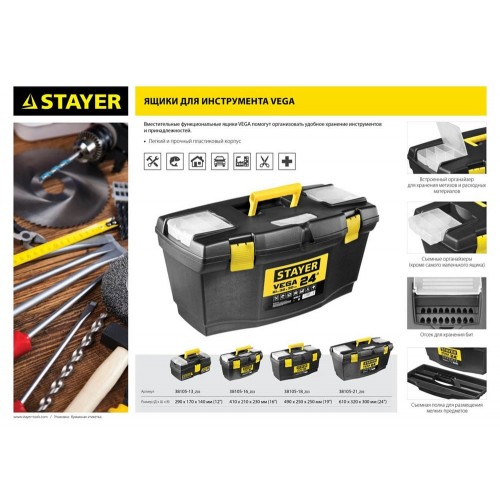 Ящик для инструмента STAYER 38105-21_z03, применяется для хранения инструментов и принадлежностей. Вместительный функциональный ящик поможет организовать удобное хранение инструментов и принадлежностей.