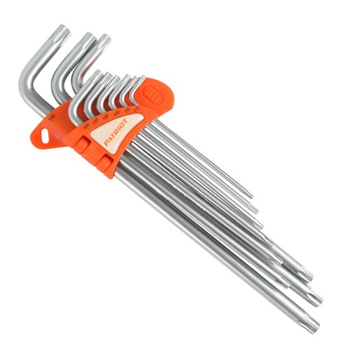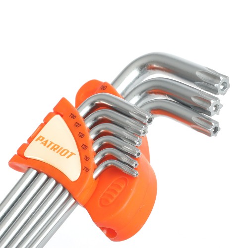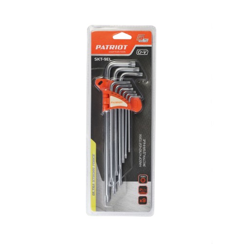 Комплект ключей PATRIOT SKT-9 EL включает в себя девять двухсторонних шестигранных ключей экстра-длины, сделанных из хромованадиевой стали с антикоррозийным покрытием. Виды ключей в наборе: Т10, Т15, Т20, Т25, Т27, Т30, Т40, Т45, Т50. Для хранения и переноски в комплекте идёт пластиковый держатель.