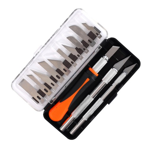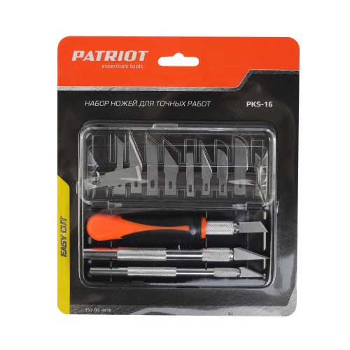 Комплект ножей PATRIOT PKS-16 со сменяемыми лезвиями для резки тонких материалов. В комплекте идёт 13 стальных полотен разной формы и три рукояти разной толщины. Для удобного хранения инструментов в комплекте идёт компактный пластиковый кейс.