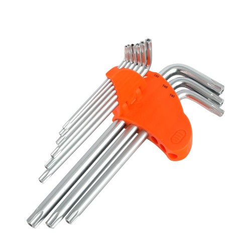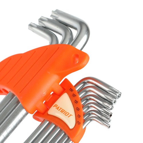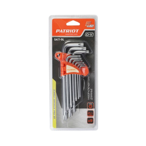 Комплект PATRIOT SKT-9 L включает в себя девять двухсторонних шестигранных ключей увеличенной длины, сделанных из хромованадиевой стали с антикоррозийным покрытием. Виды ключей в наборе: Т10, Т15, Т20, Т25, Т27, Т30, Т40, Т45, Т50. Для хранения и переноски в комплекте идёт пластиковый держатель.