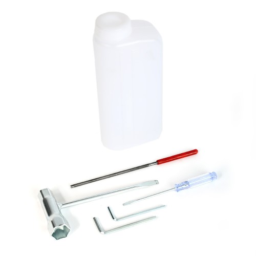 В комплекте поставки - емкость для смешивания топливной смеси,  напильник для заточки цепи, необходимый для обслуживания набор инструмента.