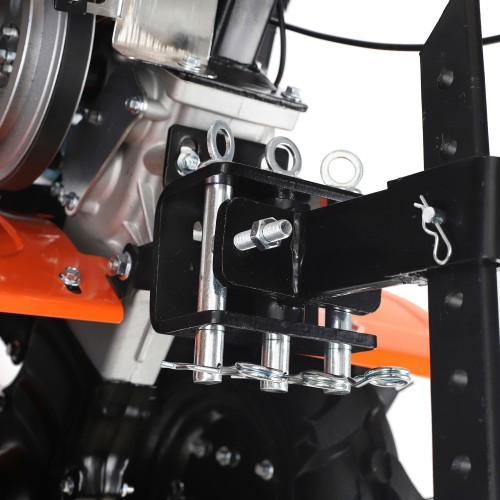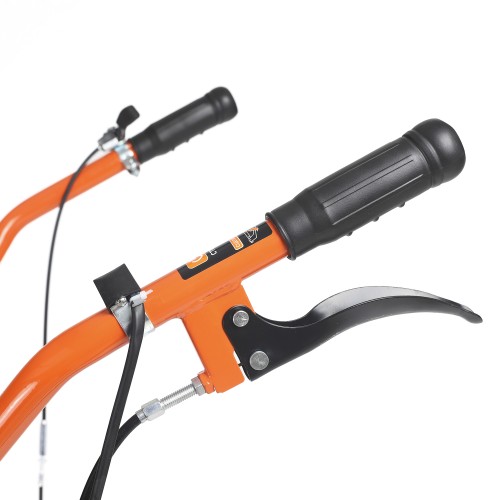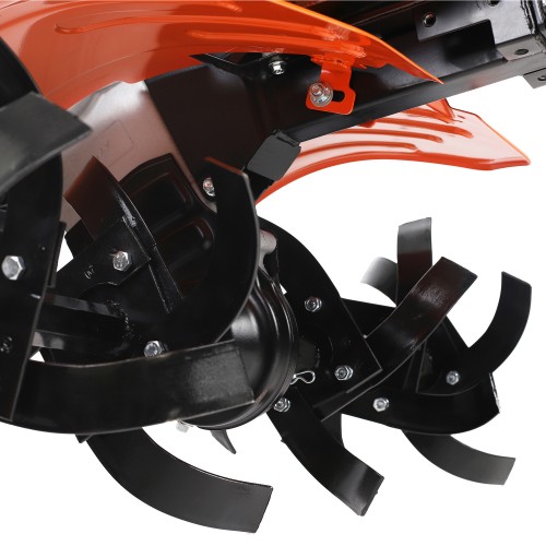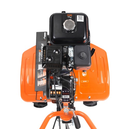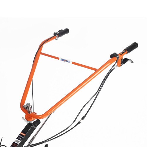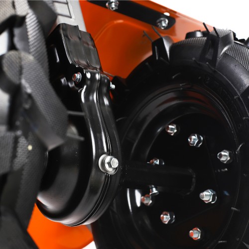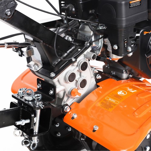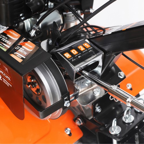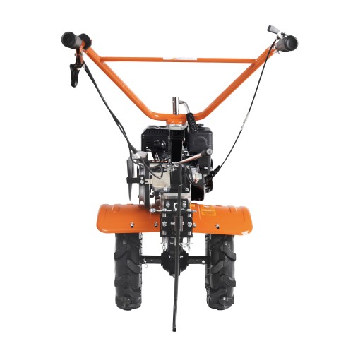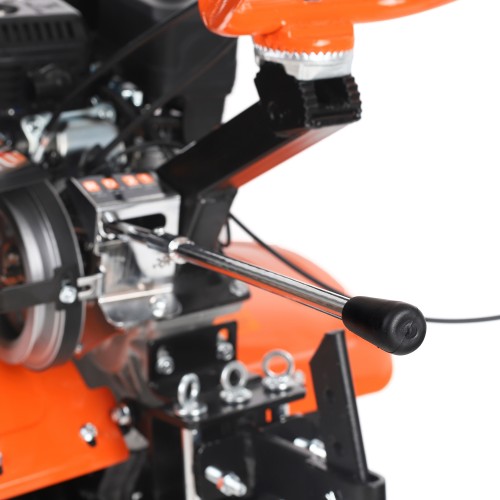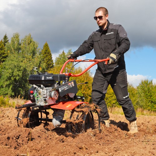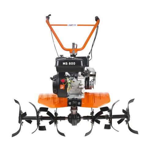 МБ 800 – бензиновый мотоблок с пониженной передачей и цепным редуктором в цельнолитом корпусе. Мотоблок оснащен четырехтактным двигателем с воздушным охлаждением. В комплектации закаленные фрезы, пневматические колеса с глубоким профилем протектора, сошник. Укрепленная рама с универсальной сцепкой позволяет установить дополнительное навесное оборудование или использовать вместе с тележкой. Кнопка включения, рукоятка газа и рычаг привода расположены на руле. Рычаг трансмиссии позволяет выбрать скорость и направление движения. Наклон руля регулируется.