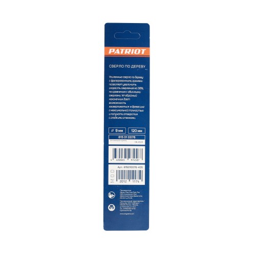 Наружный диаметр: 9 мм;  Хвостовик: 9 мм; Длина сверла: 120 мм;  Обрабатываемый материал: дерево; Материал сверла: инструментальная сталь;