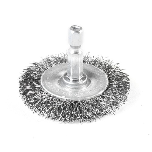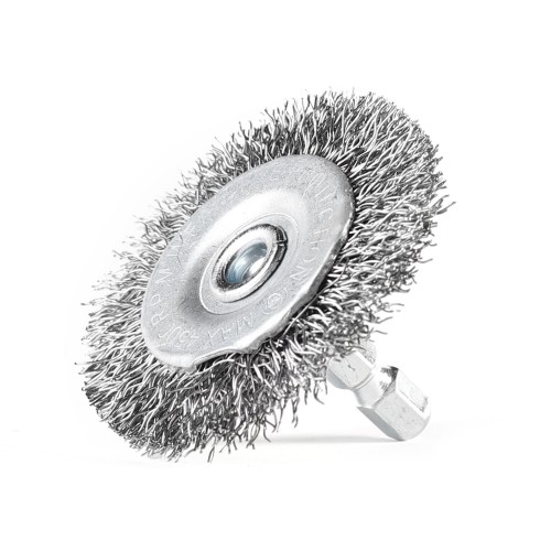 круглая проволочная щетка для дрели; предназначена для снятия лака;  краски;  зачистки ржавчины;  Наружный диаметр: 50мм;  вал шестигранник; гофрированная проволока